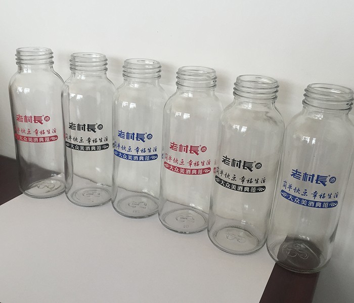 蒙砂酒瓶是在制品玻璃上,粘附一定大小面積的玻璃色釉粉,玻璃瓶廠經(jīng)過(guò)580~600℃的高溫烘烤,使玻璃色釉涂層凝結(jié)在玻璃外表,并顯現(xiàn)出具有與玻璃主體不同顏色的一種裝飾辦法。粘附玻璃色釉粉,可用排筆涂刷,亦可用膠輥滾涂。經(jīng)過(guò)絲印加工,能夠得到蒙砂面的樓空?qǐng)D案。 其辦法是:在玻璃制品外表上,絲印一層由阻熔劑構(gòu)成的圖案紋樣。